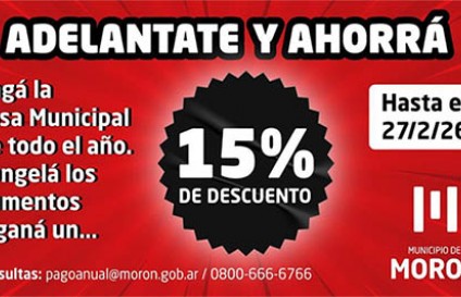 El Municipio de Morón lanzó un beneficio para las y los contribuyentes que abonen de manera anticipada el importe completo correspondiente al año 2026 de la tasa municipal. Quienes realicen el pago hasta el 27 de febrero próximo recibirán un descuento del 15% sobre el valor anual estimado y evitarán los posibles aumentos que pudieran aplicarse durante el año.