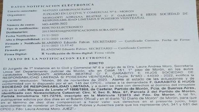 El Juzgado de 1º Instancia en lo Civil y Comercial Nº 6 a cargo de la Dra. Laura Andrea Moro, Secretaría Unica del Departamento Judicial de Morón, sito en Colon 151, 1° piso de Morón, en los autos caratulados “MORGANTI ADRIANA BEATRIZ C/ F. GARABITO E HIJOS SOCIEDAD DE RESPONSABILIDAD LIMITADA S/ POSESION VEINTEAÑAL”, Expte. N°MO - 44030 – 2022, notifica la siguiente resolución: “Morón, 05 de noviembre de 2023.