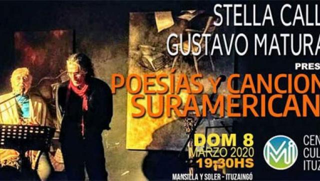 El Municipio realizará el espectáculo “Poesías y canciones sudamericanas”, a cargo de Stella Calloni y Gustavo Maturano, el próximo domingo 8 de marzo a las 19.30 hs en el Centro Cultural Ituzaingó (Soler y Mansilla).