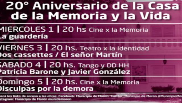 En el marco de la conmemoración del 20º aniversario de la Casa de la Memoria y la Vida, el municipio de Morón organizó una serie de actividades virtuales, debido a las medidas de aislamiento social preventivo y obligatorio vigentes.