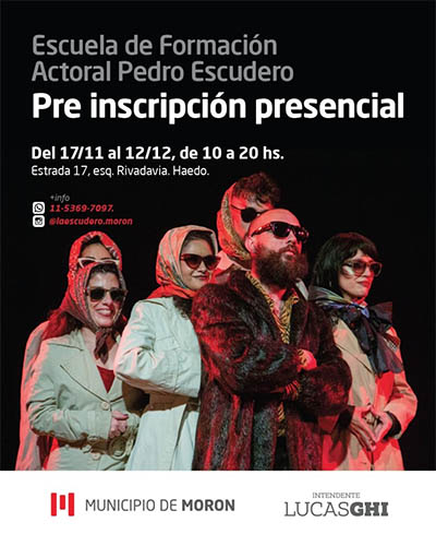 El Municipio de Morón anunció la apertura de la preinscripción para la Escuela de Formación Actoral Pedro Escudero, un espacio municipal gratuito dedicado a la formación y creación teatral. La inscripción se realizará de forma presencial entre el 17 de noviembre y el 12 de diciembre, de 10 a 20 h, en Estrada 17, esquina Rivadavia, Haedo.