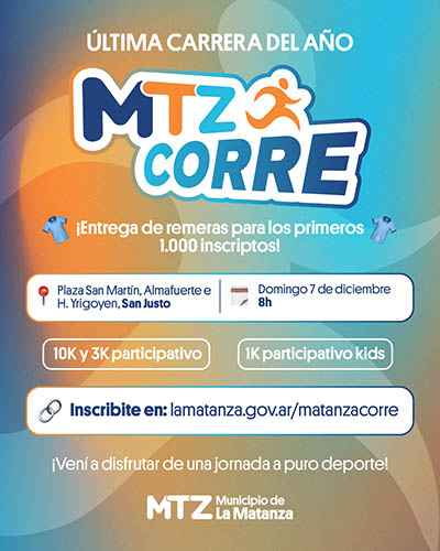 La Matanza se prepara para vivir una jornada deportiva única con la última edición del año de Matanza Corre, el evento gratuito que reúne a vecinos y vecinas de todas las edades en torno al deporte y la vida saludable. La cita será el domingo 7 de diciembre a las 8 horas, en la Plaza San Martín de San Justo, ubicada en Almafuerte e Yrigoyen.
