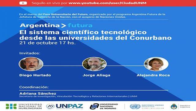 La UNM invita a participar del panel “El sistema científico-tecnológico desde las universidades del Conurbano”, el segundo encuentro del ciclo de charlas organizado por UNAHUR, UNPAZ y la UNM en el marco del Foro Universitario del Futuro y Argentina Futura, que se desarrollará este miércoles 21 de octubre a las 17 hs.