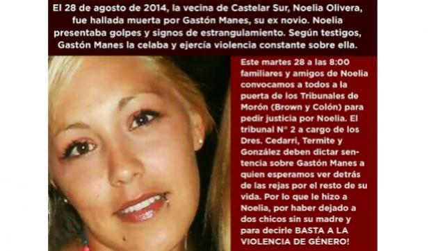 Este martes, familiares y amigos de Noelia Olivera se concentrarán en la puerta de los Tribunales de Morón para pedir justicia por Noelia, víctima de femicidio en Castelar Sur en agosto de 2014. El principal imputado es Gaston Manes, su ex novio.