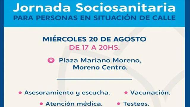 Cuerpo de la nota: Este miércoles 20 de agosto, de 17 a 20 horas, la Municipalidad de Moreno llevará adelante una jornada sociosanitaria destinada a personas en situación de calle. La actividad se desarrollará en la Plaza Mariano Moreno y ofrecerá diversos servicios gratuitos con el objetivo de garantizar el acceso a derechos básicos.