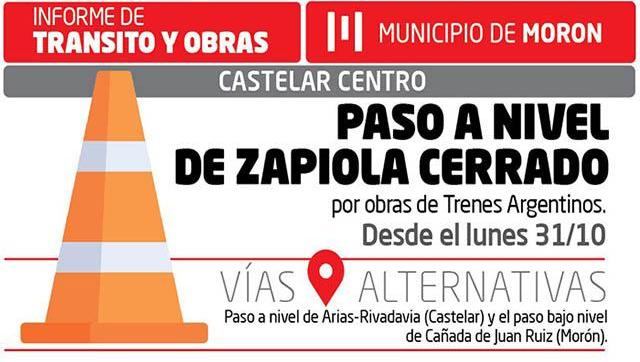 Desde el lunes 31 de octubre se encuentra cerrado el cruce Zapiola en Castelar del ferrocarril Sarmiento, por obras de mejoramiento vehicular realizadas por Trenes Argentinos. Las refacciones se llevarán a cabo en un plazo estimado de 3 semanas.