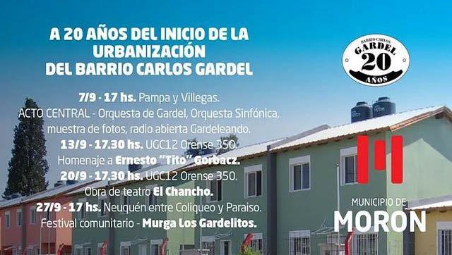El Municipio de Morón organiza una serie de actividades a lo largo de septiembre para celebrar una obra de vital importancia para la comunidad del partido de Morón que cumple 20 años: el comienzo de las intervenciones de urbanización del Barrio Carlos Gardel de El Palomar.