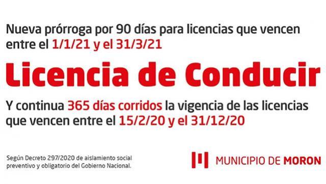 El mnicipio de Morón extiende nuevamente los vencimientos de las Licencias de Conducir por un plazo de 90 días, para aquellas que expiren entre el 1/1/2021 y el 31/3/21. Asimismo, continúa vigente la prórroga de 365 días corridos para quienes tenían fecha de vencimiento entre el 15/2/20 y el 31/12/20.