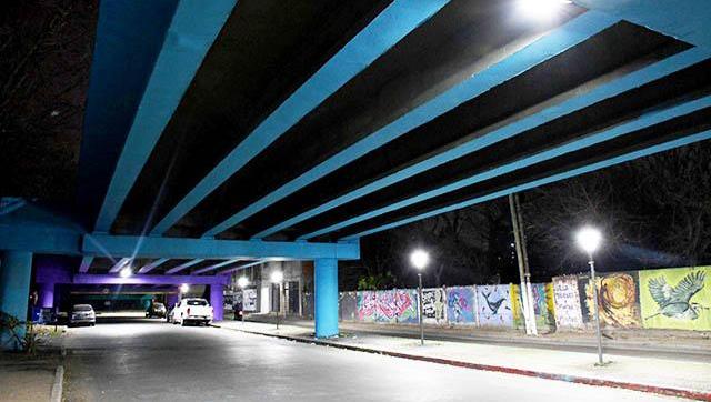 En esta primera etapa, se cambiaron 24 artefactos de sodio por nuevas luminarias LED que, además de renovar el alumbrado, contribuyen a reducir el consumo de energía eléctrica. Además, se intervinieron los murales ubicados en las paredes del Club 77 y del edificio de Tribunales, junto con la limpieza, renovación de color y embellecimiento de las columnas del puente.