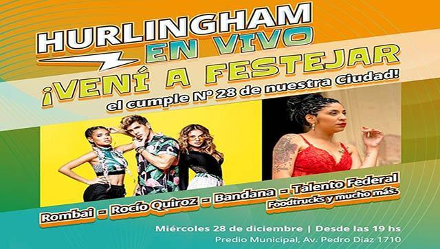Este miércoles, 28 de diciembre, el Municipio de Hurlingham ofrecerá un repertorio de espectáculos en vivo, música y foodtrucks en el Predio Municipal, para celebrar su 28° aniversario. Además, el intendente Juan Zabaleta participará conmemorando a más de 160 veteranos de Malvinas que son vecinos del distrito.