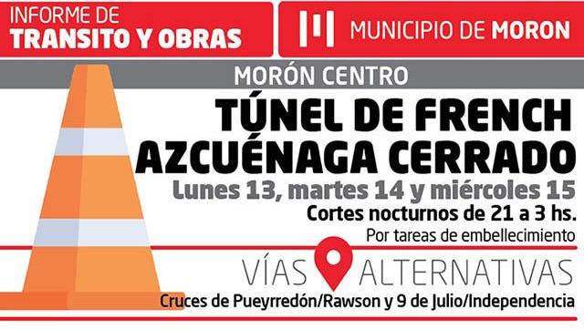 El Municipio informó que el túnel de French-Azcuénaga permanecerá cerrado de 21 a 3hs los días lunes 13, martes 14 y miércoles 15 de noviembre, debido a tareas de embellecimiento.