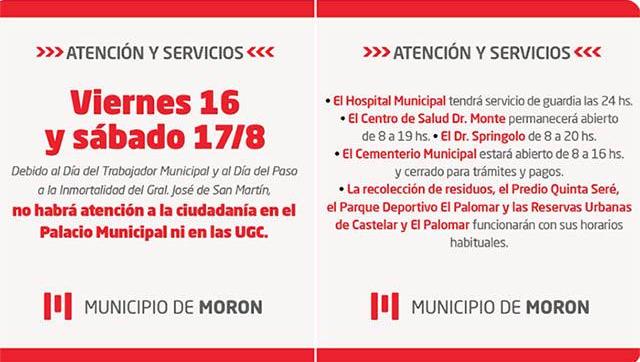 El Municipio de Morón dio a conocer como será el funcionamiento de los principales servicios durante el asueto por el Día del Trabajador Municipal, mañana viernes 16 y el feriado por el Día del Paso a la Inmortalidad del General José de San Martín, el sábado 17 de agosto.