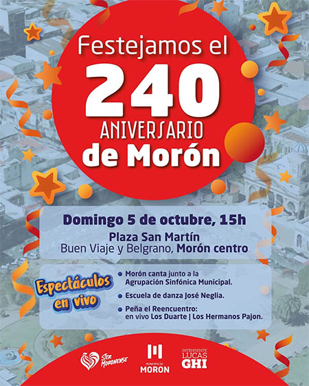 Morón cumple 240 años y lo celebra con una gran fiesta abierta a toda la comunidad. El evento será el domingo 5 de octubre, desde las 15 hs, en la Plaza San Martín (Buen Viaje y Belgrano, Morón centro), con espectáculos artísticos, música en vivo, danzas y actividades recreativas para todas las edades.