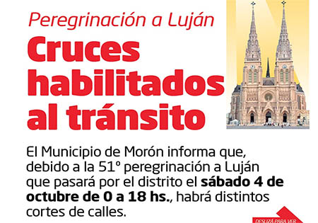 Con motivo de la 51° Peregrinación Juvenil a Luján, el Municipio de Morón llevará adelante este sábado 4 de octubre un operativo especial de tránsito y asistencia, entre las 0 y las 18 hs. La medida busca acompañar el paso de miles de peregrinos y garantizar el orden en la circulación del transporte público y vehicular.