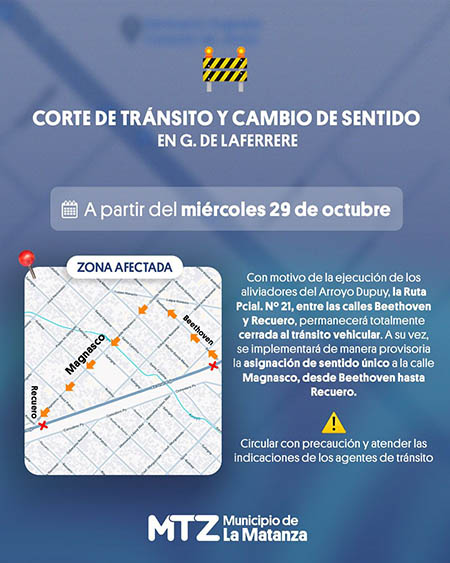 El Municipio de La Matanza informó que, a partir del miércoles 29 de octubre, se implementarán modificaciones en el tránsito vehicular en Gregorio de Laferrere debido al avance de la obra hidráulica del Arroyo Dupuy, parte de un ambicioso plan de infraestructura que busca mitigar el riesgo hídrico en la región.
