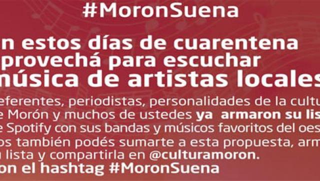 El municipio de Morón, a través de la Dirección de Cultura, lanzó la convocatoria #MoronSuena para que referentes de la música, el periodismo, la radio y otras expresiones artísticas del oeste se sumen a la iniciativa de difundir y dar a conocer el trabajo de artistas locales, para musicalizar el período de aislamiento obligatorio.