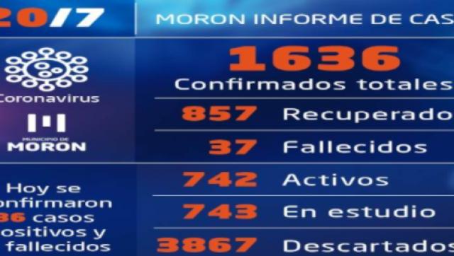 El municipio de Morón informó de dos fallecimientos (una mujer de 74 y un hombre de 62 años) y 86 casos positivos de Covid 19 (39 hombres y 47 mujeres), que llevan la cantidad de positivos desde el inicio de la pandemia a 1.636.