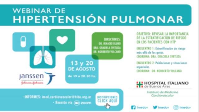 El Instituto de Medicina Cardiovascular del Hospital Italiano de Buenos realizará un simposio sobre “Hipertensión Pulmonar”, el jueves 13 y 20 de agosto a las 19 horas por plataforma virtual Zoom.