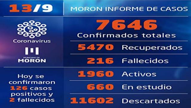 El Municipio de Morón registró el fallecimiento de dos vecinos y 126 casos positivos (64 mujeres y 62 hombres), que llevan la cantidad de confirmados a 7.646, mientras que los recuperados desde el inicio de la pandemia son 5.470 y los activos, 1.960.