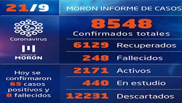 De este modo, el número de moronenses que perdieron la vida como consecuencia de Covid 19 asciende a 248 mientras que los confirmados desde el inicio de la pandemia son 8.548 y los recuperados, 6.129. Los casos activos al día de hoy son 2.171.