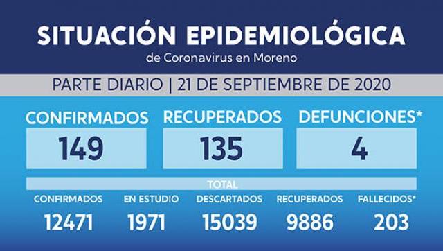 En Moreno hay 149 nuevos casos confirmados, 135 recuperados y 4 defunciones.