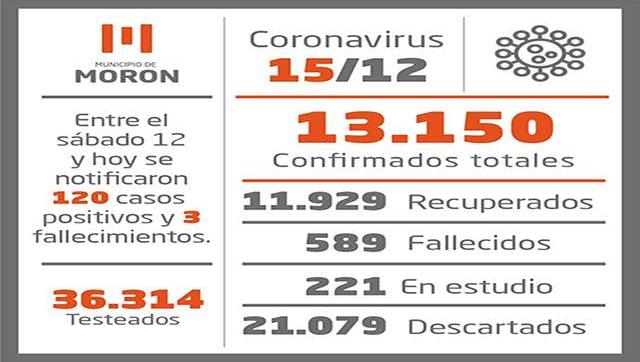 Las altas médicas llegaron a 11.929, luego de que se reportaran 106 casos recuperados entre el viernes 12 y hoy. Por último, se informó la muerte de 2 hombres y 1 mujer, llevando el total de decesos por Covid a 589 moronenses.
