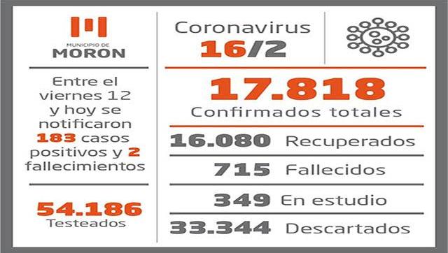 El Municipio de Morón dio a conocer que desde la noche del viernes 12 se notificaron 183 casos positivos de coronavirus (95 mujeres y 88 hombres), que llevan el número de confirmados a 17.818 personas desde el inicio de la pandemia.