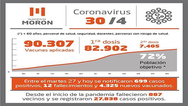 Se trata de 334 mujeres y 465 hombres que elevan la cantidad de casos confirmados a 27.838; mientras que las altas médicas sumaron 741 personas y alcanzaron las 24.041 desde el inicio de la pandemia. En los últimos tres días se registraron 12 nuevos fallecimientos, cuatro mujeres de 61, 88, 91 y 96 años y ocho varones de 58, 65, 71, 74, 76, 85 y 92 años por lo que actualmente los moronenses que murieron como consecuencia del Covid-19 son 887.