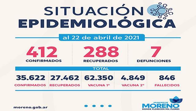 En el Municipio de Moreno ya se aplicaron 67.199 vacunas contra el COVID-19, de las cuales 62.350 corresponden a la primera dosis y 4.849 a la segunda.