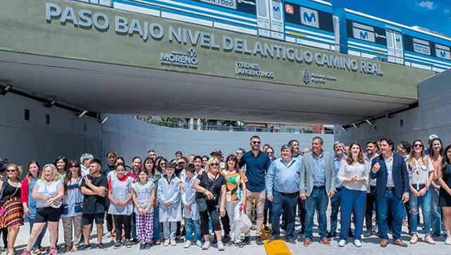 La intendenta de Moreno, Mariel Fernández y el presidente de Trenes Argentinos, Martin Marinucci, acompañados por comerciantes, docentes, veteranos de Malvinas, estudiantes y vecinos de Paso del Rey, celebraron la habilitación del nuevo Paso Bajo Nivel Vehicular.