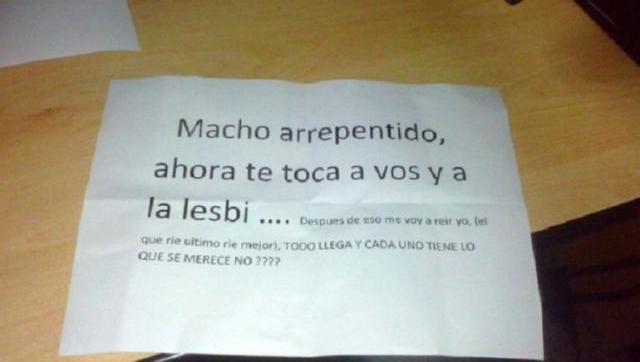 La denunciante explicó que le dejaron una nota en su lugar de trabajo que decía "macho arrepentido, a vos también te va a tocar". Tras ello, radicó una denuncia en la Fiscalía número 8 de Morón; cuando volvió, había desaparecido su fichero de su lugar de trabajo. "Se meten con algo personal de la manera más vil y retrograda. Se atentó contra mi orientación sexual, mi elección de género. Agravia mi identidad psíquica, moral y laboral", advirtió.