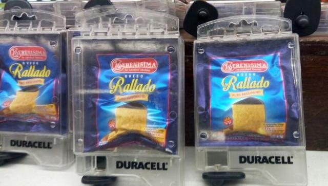 Un supermercado en Morón le puso alarmas antirrobo a los sobrecitos de queso rallado. La foto se viralizó rápidamente a través de las redes sociales como un reflejo de época.