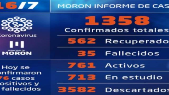 El municipio de Morón informó que, como consecuencia de la pandemia de Coronavirus, se notificaron dos fallecimientos (ambos hombres, de 69 y 72 años) y 76 casos positivos (33 mujeres y 43 hombres), que elevan el número de confirmados a 1.358 y el de fallecidos a 35.