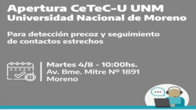 La Universidad Nacional de Moreno (UNM) pondrá en funcionamiento, mañana 4 de agosto, el Centro de Telemedicina COVID UNM en el marco del convenio con el Ministerio de Salud de la Provincia, para realizar trabajos de rastreo y seguimiento telefónico de personas que hayan tenido contacto estrecho con casos de covid-19 positivo.