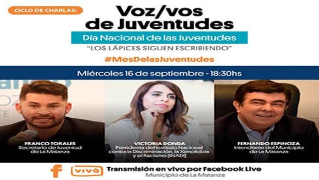 Hoy miércoles 16 de septiembre a las 18:30 hs, se llevará a cabo el conversatorio de Voz/vos de Juventudes, el ciclo de charlas de la Secretaría de Juventud de La Matanza que tiene por objeto generar un espacio de debate juvenil, y será transmitido en vivo a través de Facebook Live del Municipio de La Matanza.
