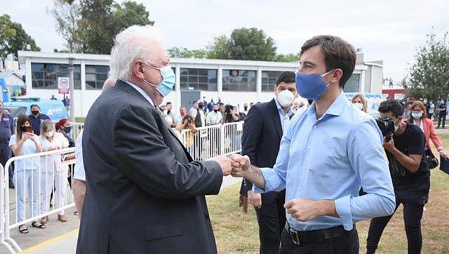 El intendente de Morón Lucas Ghi, junto al ministro de Salud de la Nación, Ginés González García, participó ayer del inicio de la campaña en el Hospital Nacional Posadas, en El Palomar, donde comenzaron a vacunarse a trabajadores y trabajadoras de la salud contra el COVID19.