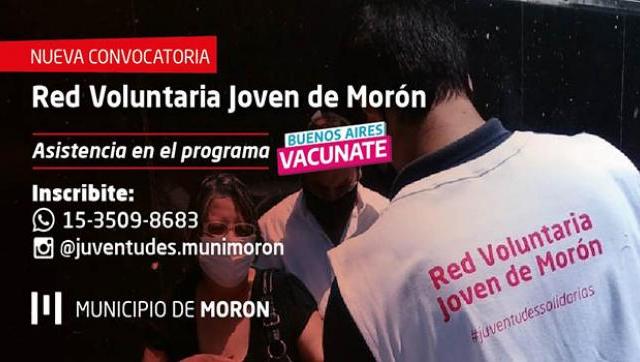 El Municipio de Morón, a través de la Red Voluntaria Joven, convoca nuevamente a jóvenes para brindar asistencia en el marco del programa provincial “Buenos Aires Vacunate” contra el Covid-19. Entre las acciones que se llevarán adelante se encuentran brindar ayuda en la realización del trámite de pre-inscripción y la asistencia en postas sanitarias en distintos territorios del partido.