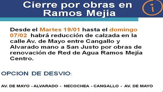 La Secretaría de Tránsito y Transporte del Municipio de La Matanza informó que a partir del día martes 19 de enero hasta el domingo 7 de febrero se reducirá la calzada en Avenida de Mayo entre Alvarado y Cangallo, mano a San Justo, por obras de renovación en la red de agua potable de Ramos Mejía centro.