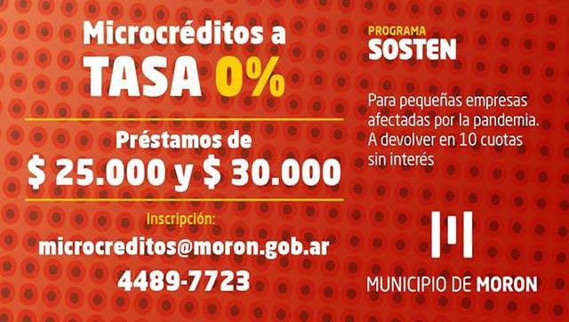 El Municipio de Morón lanza una nueva inscripción para el Programa Sostén esta vez sin fecha límite, a través del cual se otorgarán microcréditos a tasa cero de $25.000 y $30.000, a ser devueltos en 10 cuotas sin interés, con el objetivo de preservar puestos de trabajo y mitigar las consecuencias del cierre de actividades.