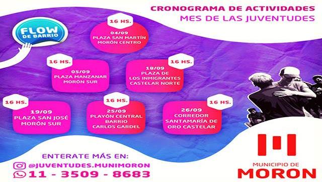 Las actividades serán a partir de las 16: el sábado 4 de septiembre en la plaza San Martín de Morón; el domingo 5 en la plaza Manzanar, de Morón sur; el sábado 18 en la plaza de Los Inmigrantes, de Castelar norte; el domingo 19 en la plaza San José, de Morón sur; el sábado 25 en el playón central del barrio Carlos Gardel; y finaliza el domingo 26 en el corredor Santa María de Oro, de Castelar.cipio organizó un cronograma de actividades para los fines de semana de septiembre, destinadas al esparcimiento y recreación de jóvenes. Las mismas serán en distintos puntos del distrito.