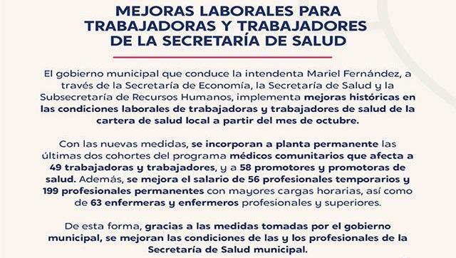 El gobierno municipal que conduce la intendenta Mariel Fernández, a través de la Secretaría de Economía, la Secretaría de Salud y la Subsecretaría de Recursos Humanos, implementa mejoras históricas en las condiciones laborales de trabajadoras y trabajadores de salud de la cartera de salud local a partir del mes de octubre.
