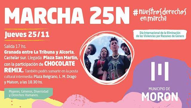La movilización pasará por la Plaza Belgrano, en Luis María Drago y Maisón, a las 18:30 y por el Palacio de Tribunales de Morón. El recorrido finalizará cerca de las 19 en la Plaza Gral. San Martín de Morón, en Belgrano y Buen Viaje, con un show en vivo a cargo de Mica Legui y Chocolate Remix.