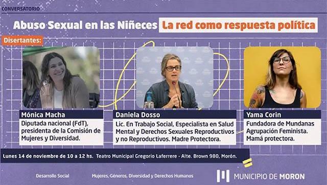Además, el próximo lunes 14 de noviembre se realizará el conversatorio “Abuso sexual en las niñeces: La red como respuesta política”, en el Teatro Municipal Gregorio de Laferrere. Será de 10 a 12 y estará a cargo de la diputada nacional Mónica Macha, la licenciada en Trabajo Social Daniela Dosso y la fundadora de Mundanas Agrupación Feminista, Yama Corin.