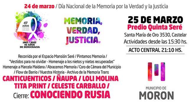 Para conmemorar el día de la Memoria por la Verdad y la Justicia y los 40 años de democracia, el Municipio de Morón organizó una jornada de diversas actividades en el Predio Quinta Seré — Polideportivo Gorki Grana para el próximo sábado 25 de marzo desde las 15:30. Habrá propuestas culturales para toda la familia y shows en el escenario principal desde las 16.30 con Canticuénticos, Ñaupa, Loli Molina, Tita Print y Celeste Carballo. Finalmente, el cierre estará a cargo de Conociendo Rusia, que se presentará luego del acto central encabezado por representantes de organismos de Derechos Humanos bajo las consignas “Memoria, Verdad y Justicia para defender la Democracia” y “Corporación judicial nunca más”.