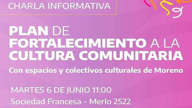 el nuevo Plan de Fortalecimiento a la Cultura Comunitaria que lanzó el Instituto Cultural de la Provincia. La misma será en la Sociedad Francesa. El Municipio de Moreno realizará una charla informativa, el día martes 6 de junio, a las 11 horas, sobre el nuevo Plan de Fortalecimiento a la Cultura Comunitaria que lanzó el Instituto Cultural de la Provincia. La misma será en la Sociedad Francesa.