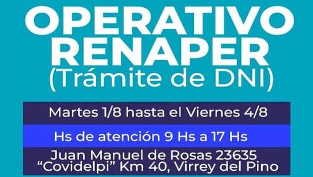 El móvil del RENAPER, estará ubicado, desde el 1 y hasta el viernes 4 de agosto, de 9 a 17 horas, en Juan Manuel de Rosas 23.635, Covidelpi, Kilómetro 40, Virrey del Pino realizando toma de datos y el sábado 5 de agosto se podrán retirarse los documentos en ese mismo lugar.