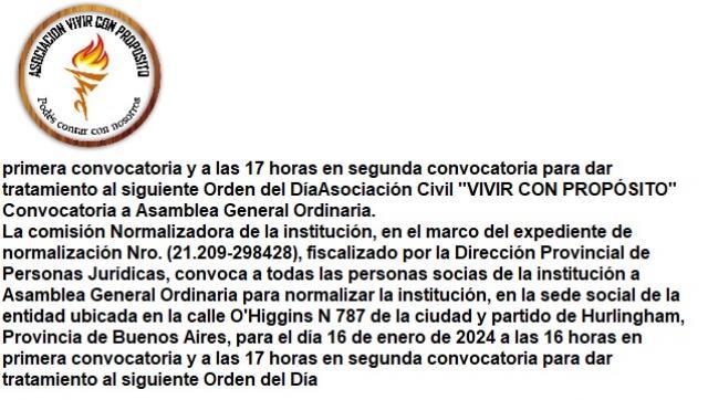 La comisión Normalizadora de la institución, en el marco del expediente de normalización Nro. (21.209-298428), fiscalizado por la Dirección Provincial de Personas Jurídicas, convoca a todas las personas socias de la institución a Asamblea General Ordinaria para normalizar la institución, en la sede social de la entidad ubicada en la calle O'Higgins N 787 de la ciudad y partido de Hurlingham, Provincia de Buenos Aires, para el día 16 de enero de 2024 a las 16 horas en primera convocatoria y a las 17 horas en segunda convocatoria para dar tratamiento al siguiente Orden del Día: