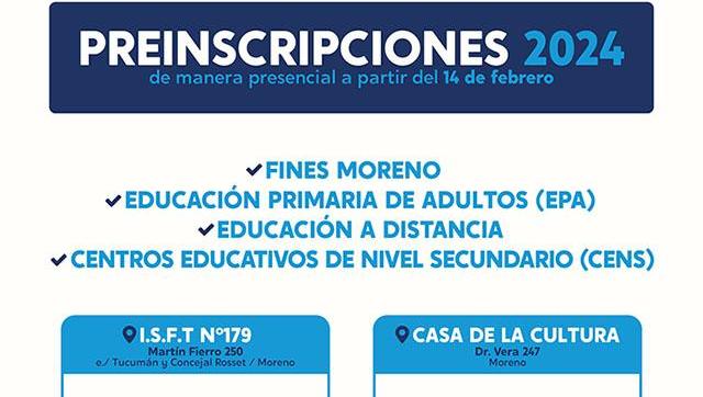 El Municipio iniciará las preinscripciones para las modalidades: FinEs, Educación Primaria de Adultos (EPA), Educación a distancia y Centros Educativos de Nivel Secundario (CENS) a partir del miércoles 14 de febrero.