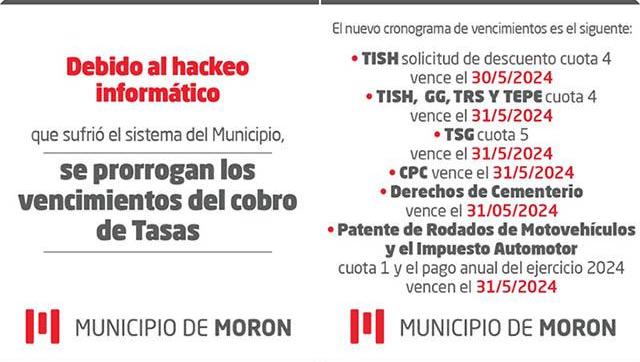 El Municipio de Morón dispuso prorrogar los vencimientos de las Tasas correspondientes a mayo, hasta restituir el normal funcionamiento del sistema municipal de cobros, que fueron afectados por un hackeo informático. La medida fue tomada en consideración por los días que permaneció fuera de servicio el sistema.