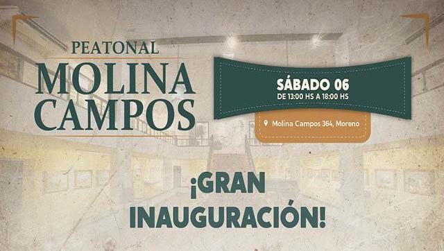 El sábado 6, de 13 a 18 horas, se inaugurará la Peatonal Molina Campos, en la calle Molina Campos 364. Habrá shows en vivo de música y danza y se presentarán el ballet Municipal de Moreno, el ballet Moreno Baila, Renacer de una Patria Nueva, el payador Ángel Barreda y el Dúo Voces Nativas. Además, habrá exposición y venta de productos artesanos.